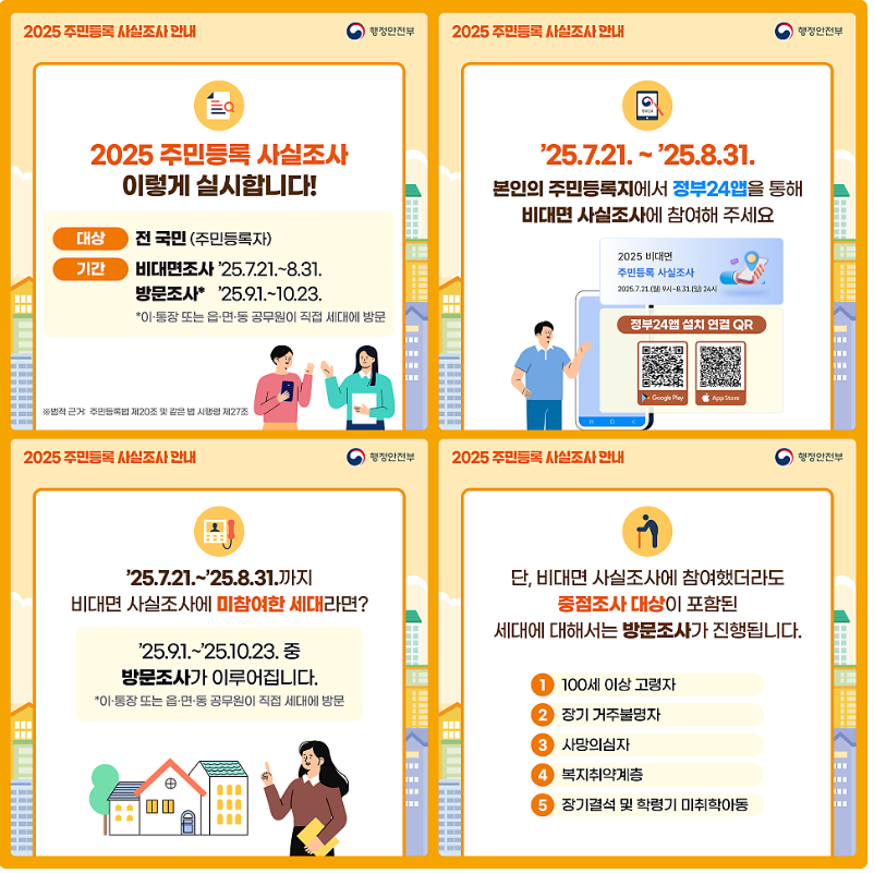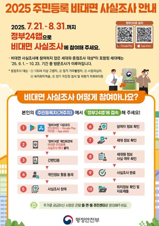주민등록 사실조사는 행정안전부와 지방자치단체가 주민등록 사항의 정확성을 확인하기 위해 실시하는 정기 조사입니다.